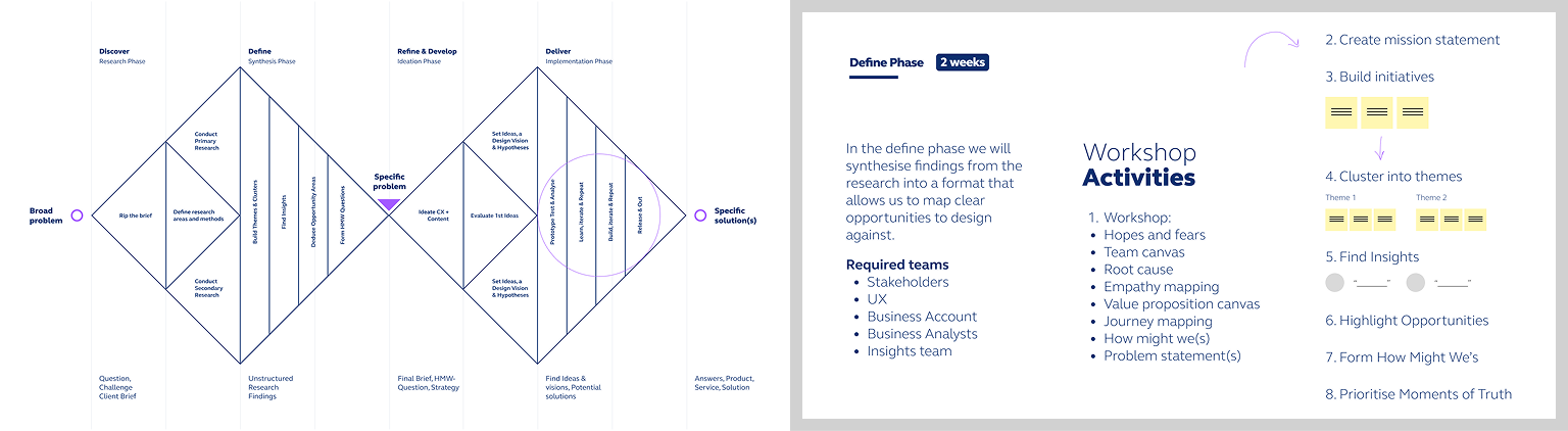 I proposed a process based on the double diamond, outlining key actions, timelines and inputs from required teams